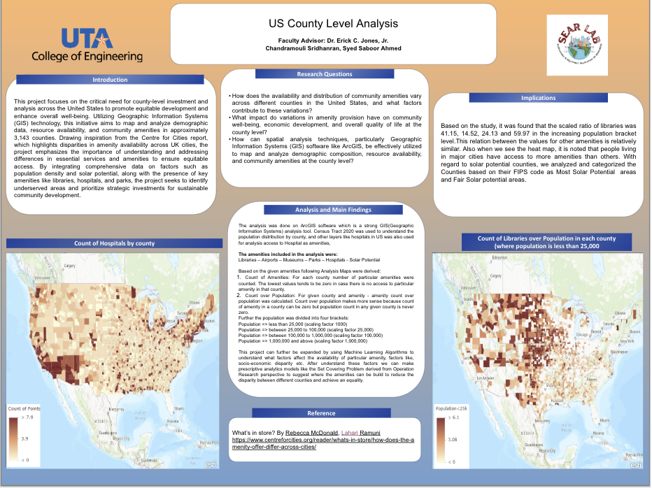 In the vast landscapes of the United States, the issue of county-level investment and analysis has emerged as a critical endeavor, demanding attention to foster equitable development and improve overall well-being. Against the backdrop of approximately 3,143 counties nationwide, the need to map and analyze demographic composition, resource availability, and community amenities has become increasingly apparent. This project aims to leverage cutting-edge technology, including Geographic Information Systems (GIS) software such as ArcGIS, to address complex challenges and inform targeted investment strategies at the county level. Our project underscores the importance of understanding and mapping essential features within each county. By integrating data on population density, solar potential, and the presence of amenities such as libraries, hospitals, museums, airports, and parks, we aim to identify areas requiring investment and prioritize resources to foster holistic community development. This approach aligns with the report’s emphasis on the need to assess and address variations in amenity provision to ensure equitable access to essential services and amenities across cities.
